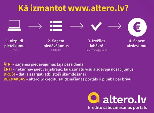 Aizdevumu salīdzināšanas platforma Altero.lv darbojas jau gandrīz gadu un tajā var viegli, ērti un bez maksas atrast sev potenciāli izdevīgāko aizdevumu. Klientam jāievada pamatinformācija par savu vajadzību, aptuveni stundas laikā platformā esošie aizdevēji atsūtīs piedāvājumus un atliks vien izvēlēties. Kad piedāvājums saņemts, klients sadarbojas tieši ar pašu banku vai kredītu kompāniju bez jebkādas starpniecības. Altero.lv salīdzināšanas portāls ir pieejams bez maksas un tam nav nekādu papildus izmaksu par darījuma noformēšanu.