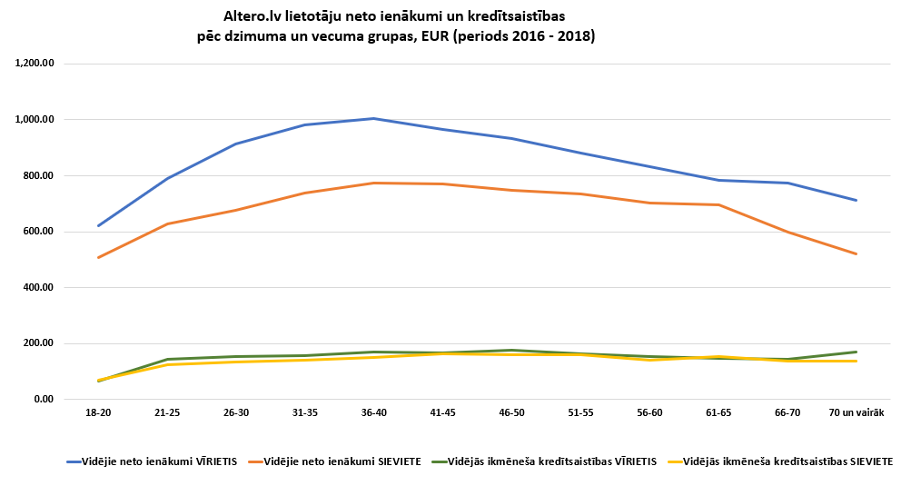 Pēc kredītu salīdzināšanas platformas Altero.lv datiem vidējā kredītņēmēju alga pēc nodokļu nomaksas sastāda 784 EUR mēnesī. Vecuma posmā no 36 līdz 40 gadiem vidējais latvietis ir sasniedzis pakāpi, kurā viņam ir vislielākie ienākumi – vīriešiem 1004 EUR pēc nodokļu nomaksas, sievietēm 774 EUR pēc nodokļu nomaksas. Savukārt ar vismazākajiem ienākumiem sadzīvo 18 līdz 20 gadus jaunie kredītņēmēji, kā arī tie, kam pāri 70.