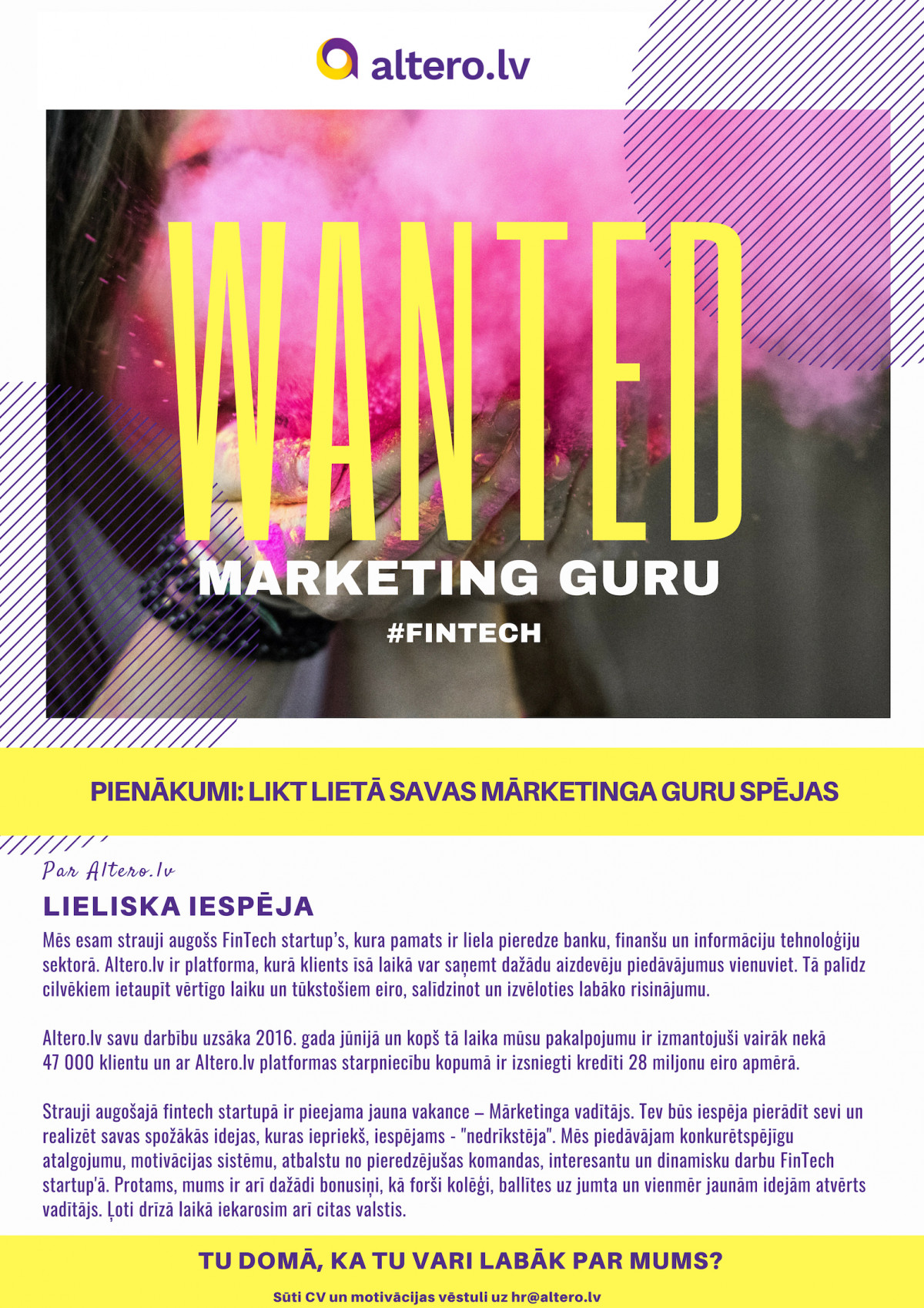 Tev būs iespēja pierādīt sevi un realizēt savas spožākās idejas, kuras iepriekš, iespējams - "nedrīkstēja". Mēs piedāvājam konkurētspējīgu atalgojumu, motivācijas sistēmu, atbalstu no pieredzējušas komandas, interesantu un dinamisku darbu. Protams, mums ir arī dažādi bonusiņi, kā forši kolēģi, ballītes uz jumta un vienmēr jaunām idejām atvērts vadītājs. Ļoti drīzā laikā iekarosim arī citas valstis.